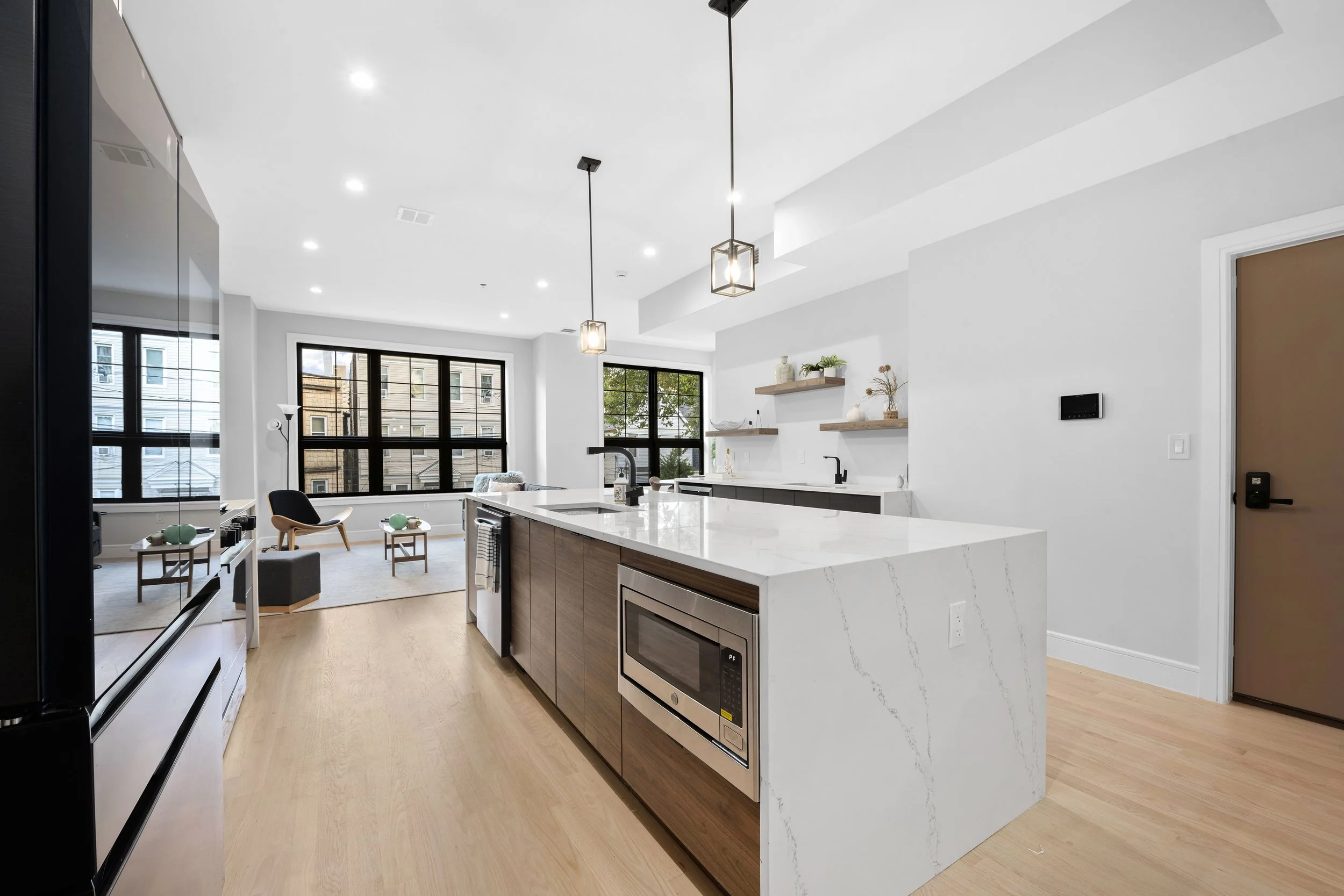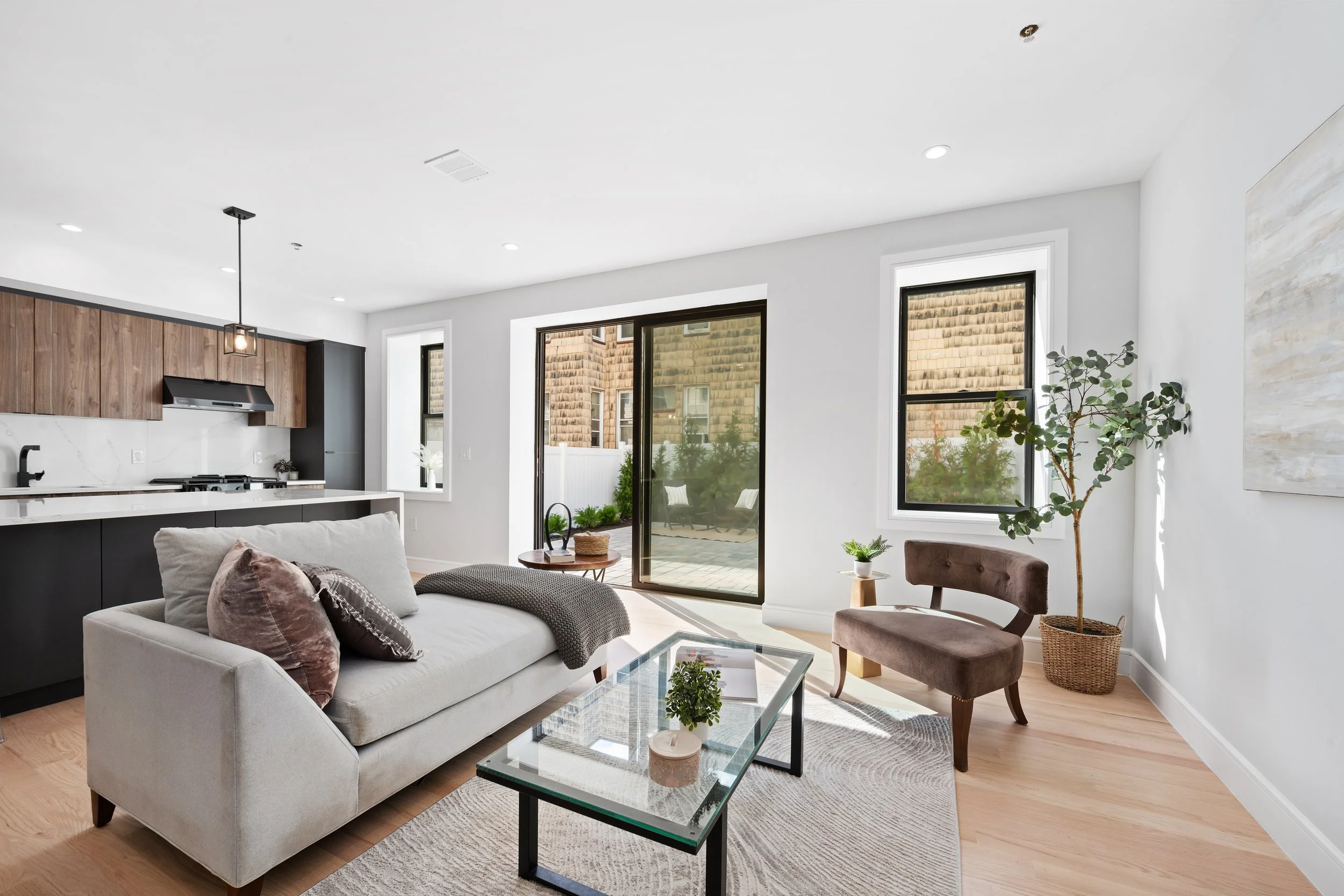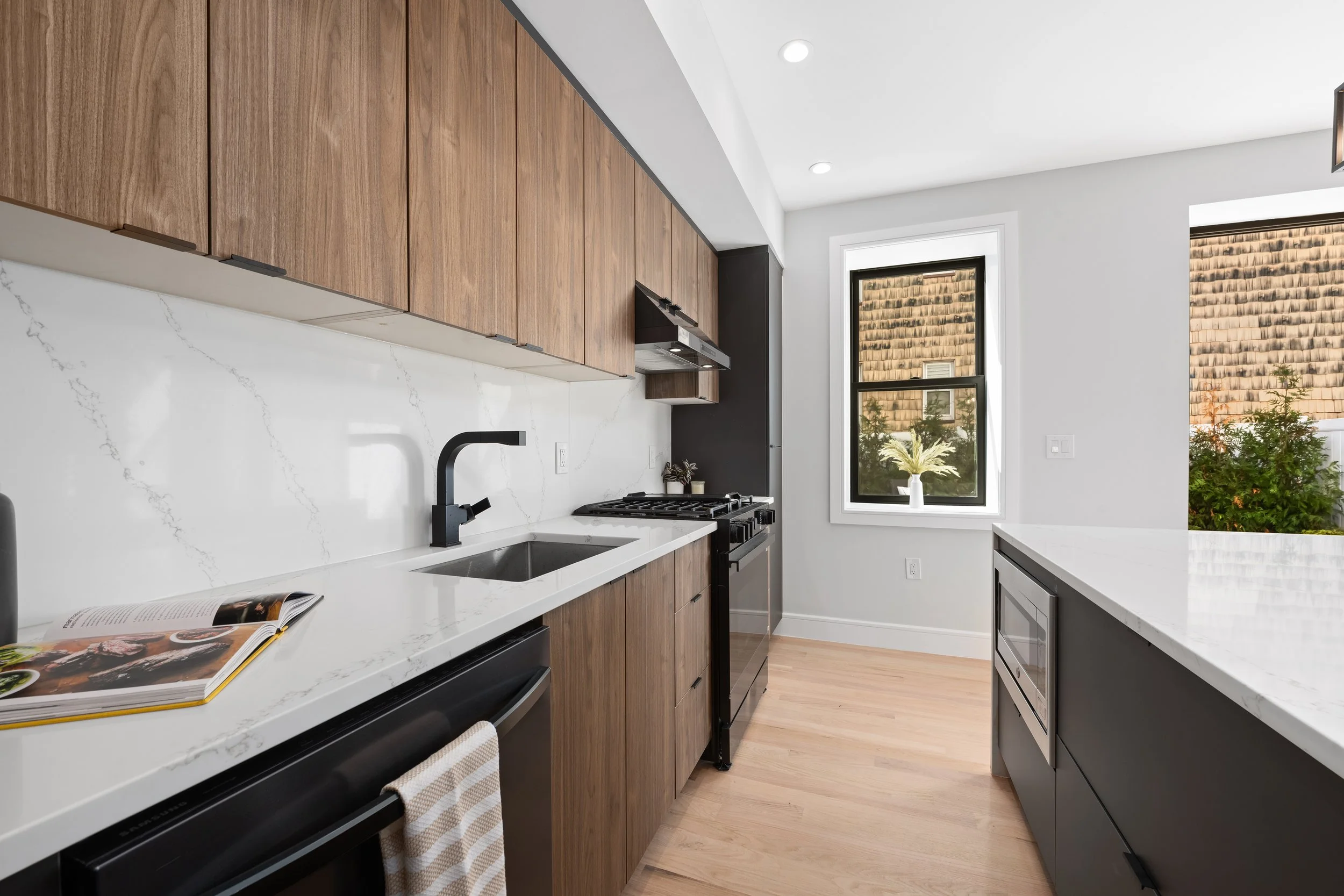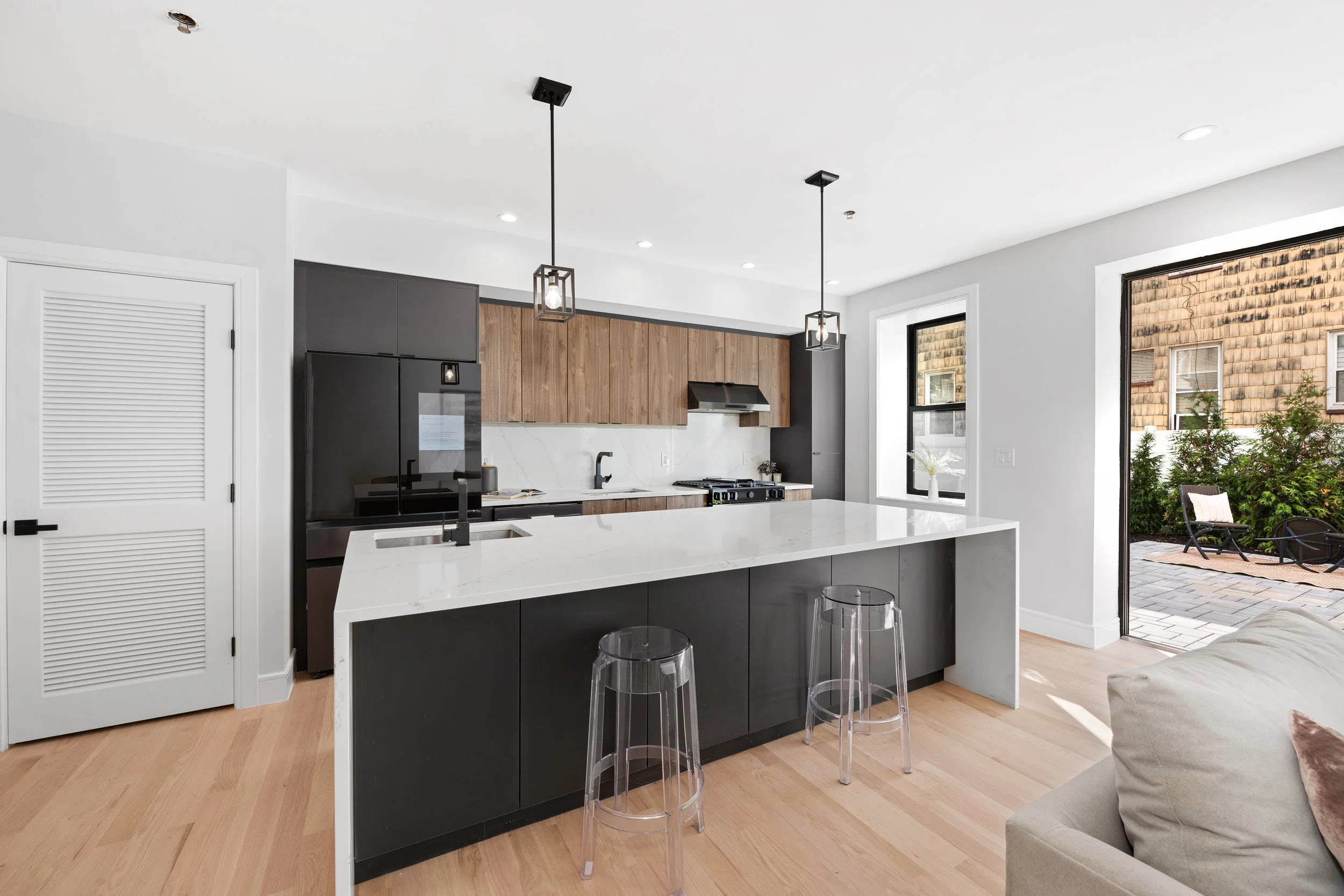 Every home at 163–165 Delaware is crafted for the way people want to live today. Wide-plank oak floors, expansive windows, and smart entry systems bring both style and convenience. Kitchens are equipped with Samsung appliances, quartz countertops, and matte black hardware for a sleek, timeless look. Bathrooms feature floor-to-ceiling porcelain tile, contemporary shower panels, and spa-like design details. Select residences offer private storage, tandem garage parking, and rare outdoor spaces ranging from rooftop decks to private gardens.