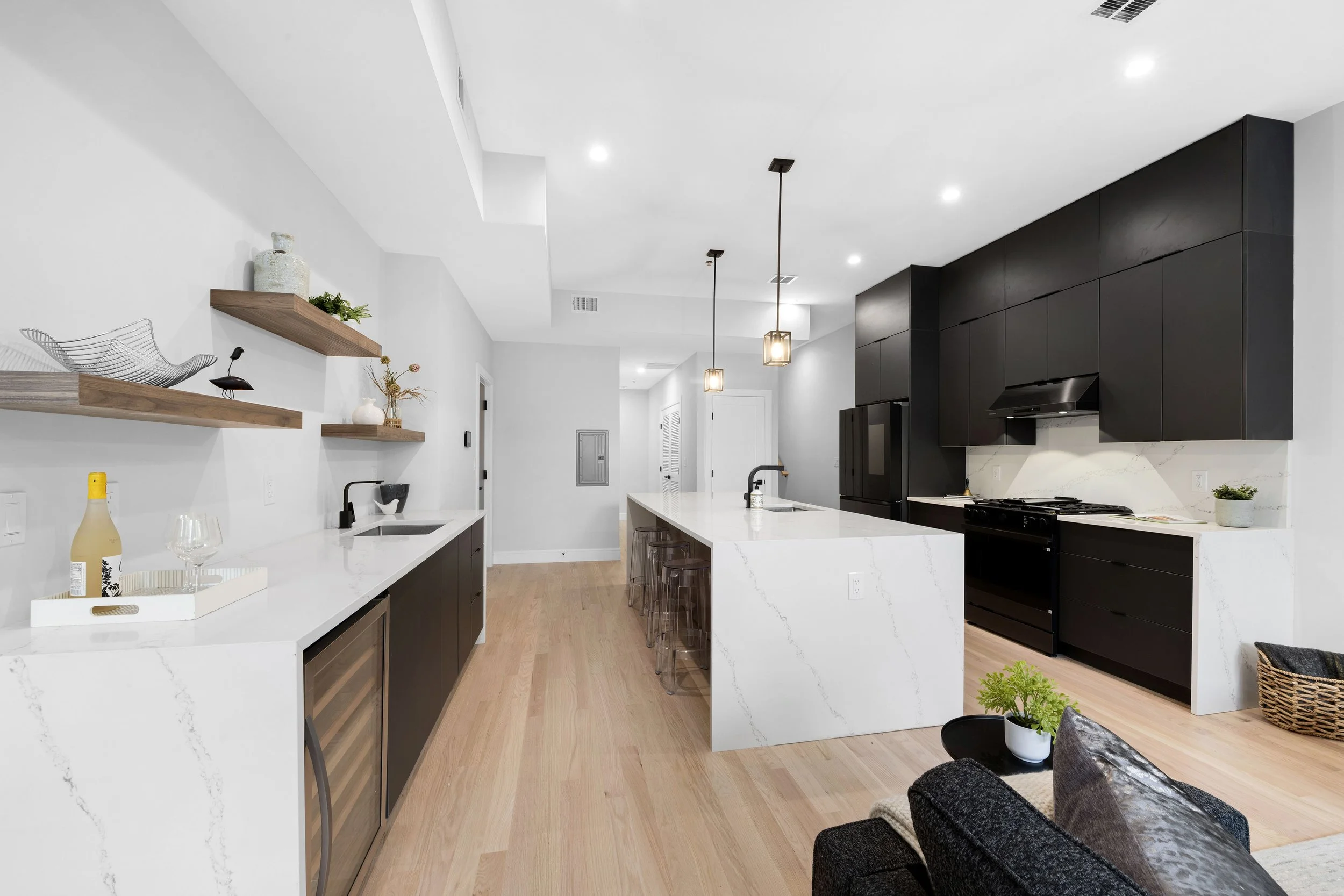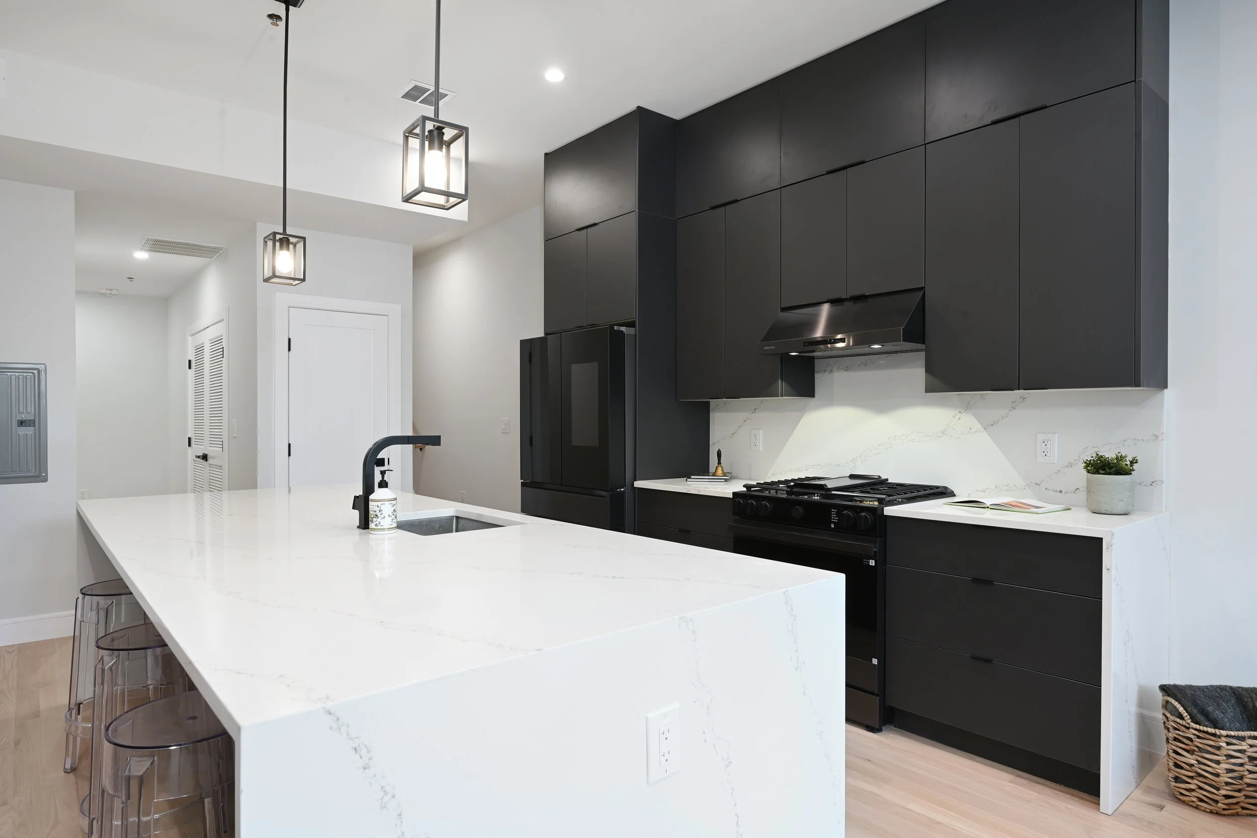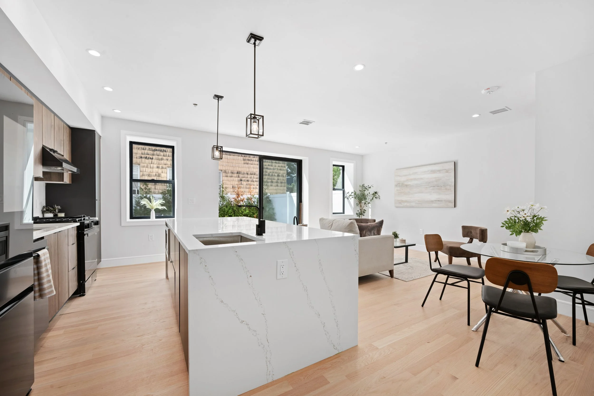 Every home at 163–165 Delaware is crafted for the way people want to live today. Wide-plank oak floors, expansive windows, and smart entry systems bring both style and convenience. Kitchens are equipped with Samsung appliances, quartz countertops, and matte black hardware for a sleek, timeless look. Bathrooms feature floor-to-ceiling porcelain tile, contemporary shower panels, and spa-like design details. Select residences offer private storage, tandem garage parking, and rare outdoor spaces ranging from rooftop decks to private gardens.